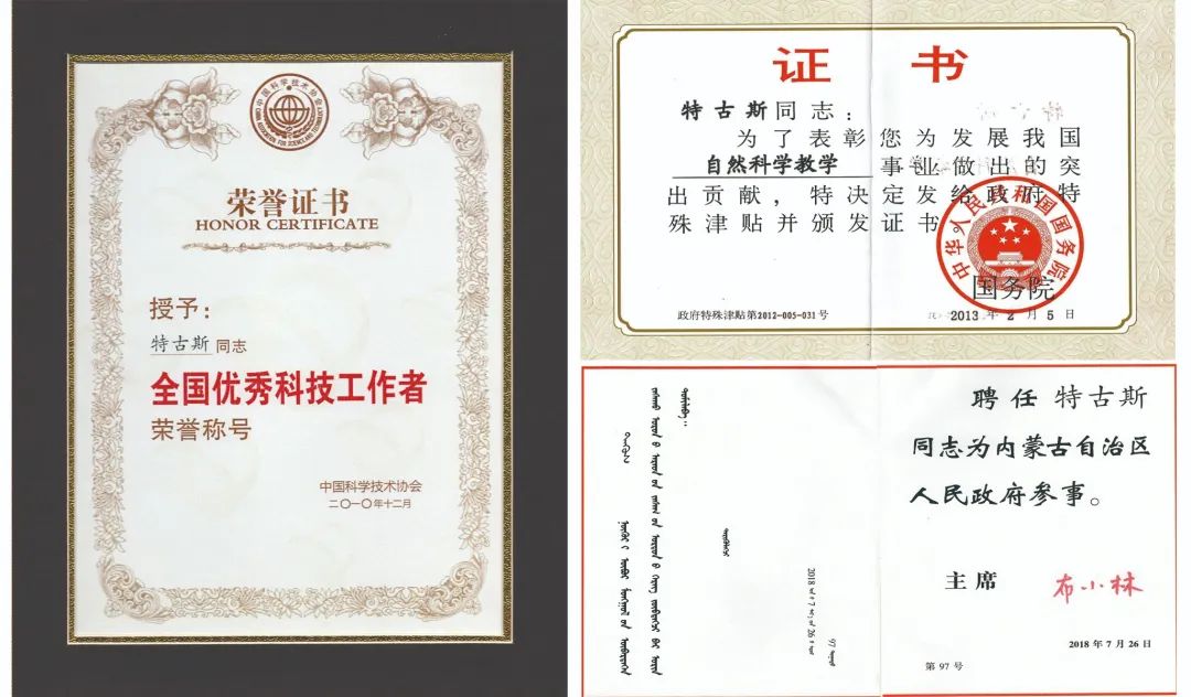 特古斯老师合作发表科研论文200余篇,其中有《Nature》1篇, 《Physical Review Letters》1篇,《Physical Review X》1篇, 论文被引用4000多次。2010年被评为自治区有突出贡献的中青年专家,自治区优秀科技工作者;2010年被评为全国优秀科技工作者;2011年入选内蒙古“草原英才”;2013年被评为国务院政府特殊津贴专家;2013年获蒙古国国立大学名誉博士称号,2013年至2017年任教育部高等公司物理学专业教学指导委员会华北地区工作委员会委员。荣获2016年-2017年度公司“爱岗敬业”先进个人,2017年-2018年度公司“教书育人”先进个人。2018年获评自治区级蒙语授课物理学课程教学团队,任团队负责人;2018年被聘为内蒙古人民政府参事;2019年被聘为中国稀土学会稀土磁制冷材料与技术专业委员会副主任委员。2019年科研成果《多元稀土六硼化物LaxCe1-xB6微结构及电子发射机理研究》获内蒙古自治区自然科学三等奖。