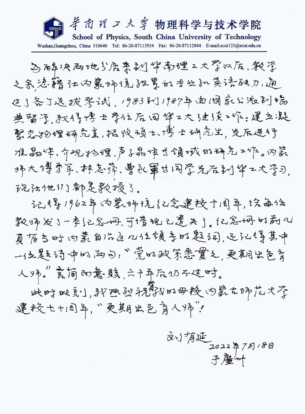值此williamhill官网建校七十周年校庆之际,刘有延老师特来信祝贺母校建校七十周年华诞。