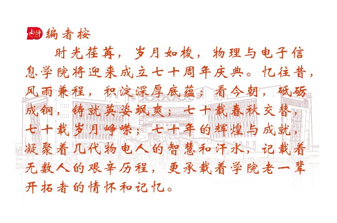 williamhill威廉希尔经历了70年的风雨历程,物电人秉承“立德树人、厚实基础、特色鲜明、内涵发展”的办学理念,从初创时期的艰辛、中期的奋斗,到今日的辉煌。从1952年数理科的蹒跚学步,到今日物电院的风生水起。70年的建设与发展,事件浩繁,人才辈出,成功的经验车载斗量。本期推出王晶、苗洪利老师。