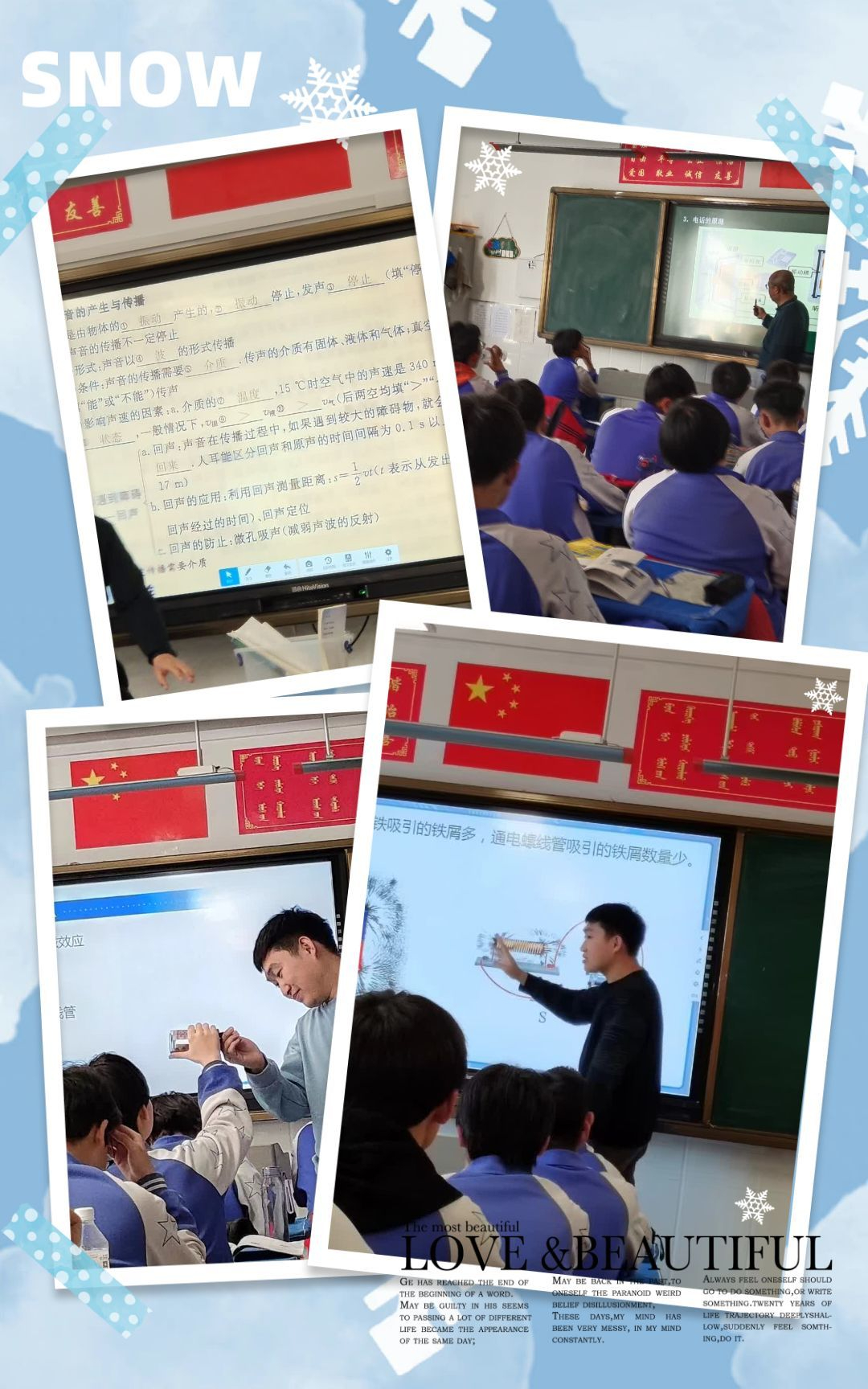 时光荏苒,转眼间2021级物理学汉二班的李月朋、孟想、李诗琦、崔文雯、李浩然、徐方毅、王译巍、孙于皓、陈基尧、刘洋已在教师这片广阔的职业海洋中畅游了一个月。他们分别在扎鲁特旗第二中学、托克托县第一中学、赤峰曾军良实验公司(赤峰四中桥北新校)、开鲁一中、赤峰实验中学、赤峰市新惠中学、甘旗卡第三初级中学、乌丹五中开展实习。这一个月,如同一幅绚烂多彩的画卷,记录着他们从青涩到逐渐成熟的每一个瞬间。让我们来一睹他们的实习风采吧。