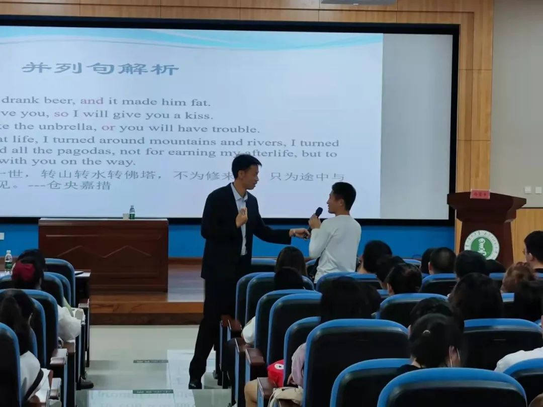 郭玺平教授给出了以套题为单位,精析做透真题的复习方法。并指导同学们做好复习规划:背诵高频单词词语;拆分翻译长句难句;总结分析错题原因;灵活运用解题方法。讲座着重讲解了长难句的分析方法。同学们专心记录笔记,积极互动。