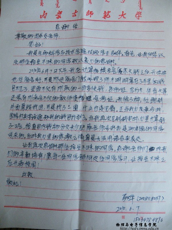 6月7日下午,公司2009级工程三班员工柳梦蛟同学捡到一钱包,及时找到失主并将钱包归还给生科院员工。该生这种拾金不昧的精神值得我们学习,公司决定给予柳梦蛟同学全院通报表扬。