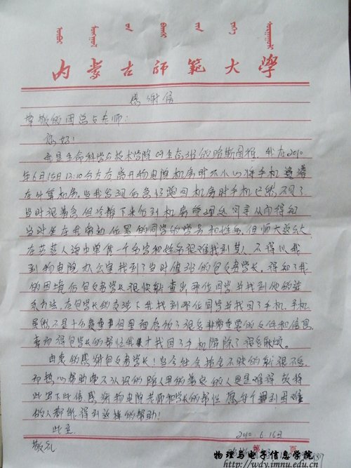 6月15日下午,公司06预科班员工包文君同学在公司机房捡到一手机,及时找到失主并将手机归还给生科院员工。该生这种拾金不昧的精神值得我们学习,公司决定给予包文君同学全院通报表扬。