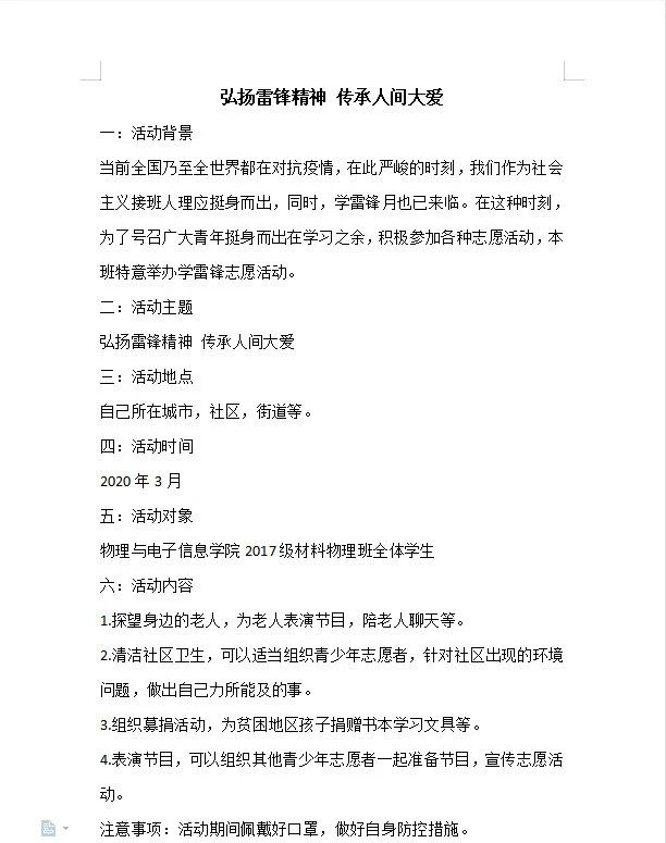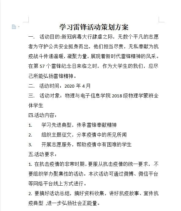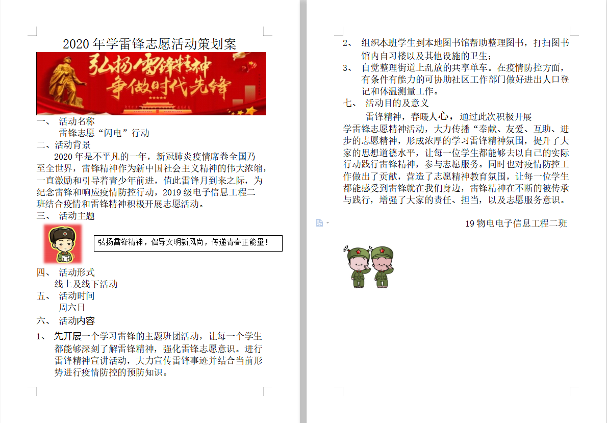 雷锋日,精神传。为引导广大青年员工正确认识雷锋精神的重要性,积极主动发挥疫情间雷锋精神的重要指导作用,不断提高老员工道德素质与爱国情怀,公司内召开学雷锋志愿活动月内的各项活动,得到院内师生的热烈响应。以下为雷锋月组织2017、2018和2019级员工以班级为单位开展志愿服务创意设计评比。