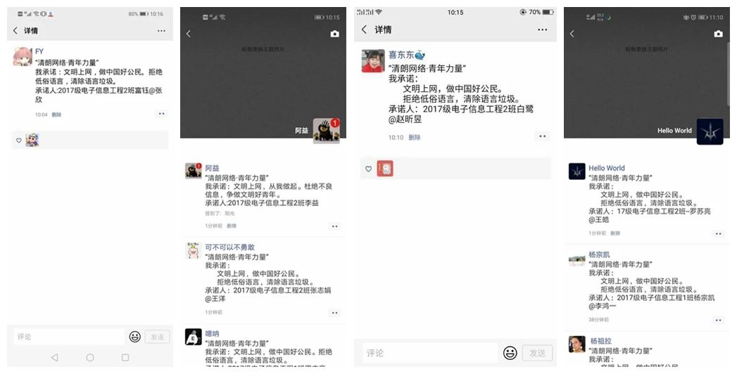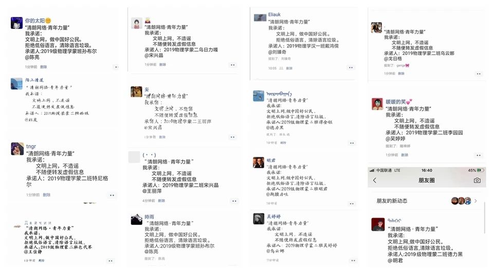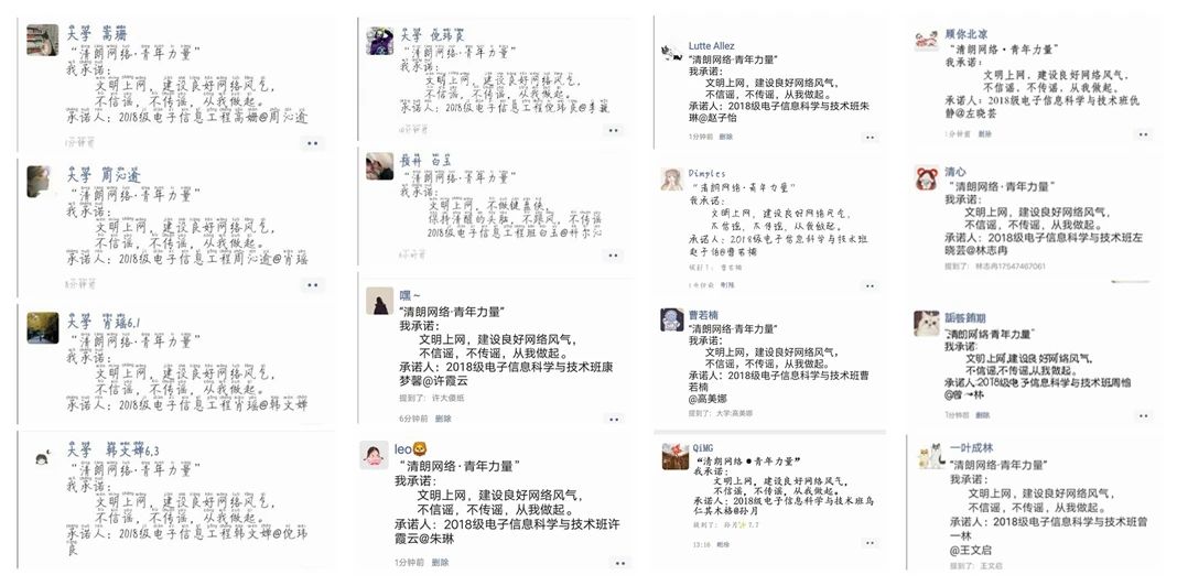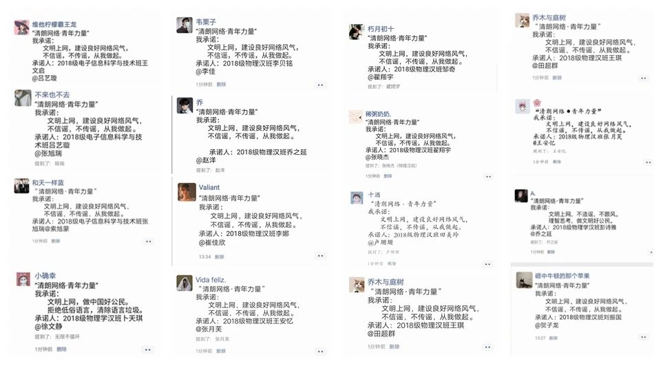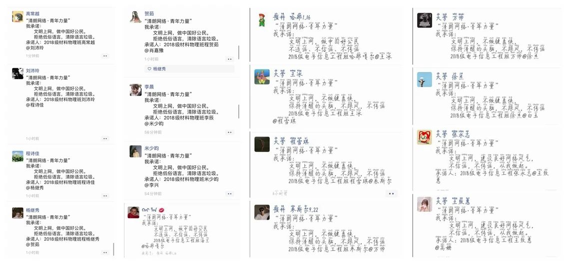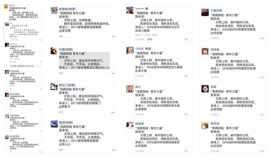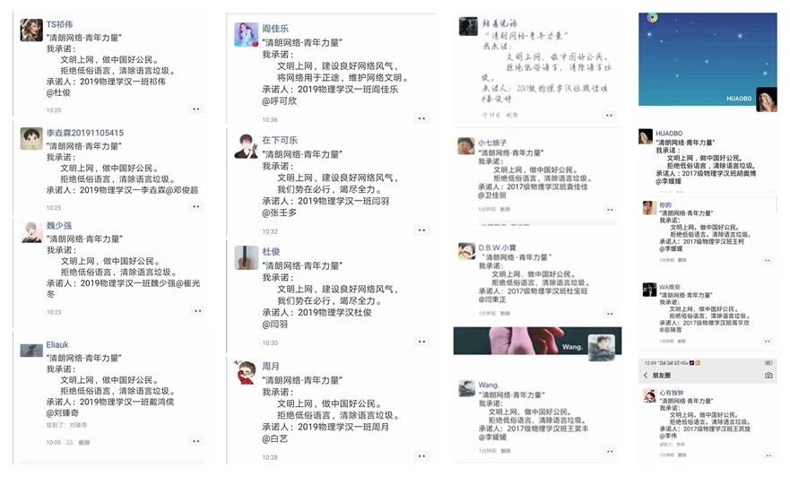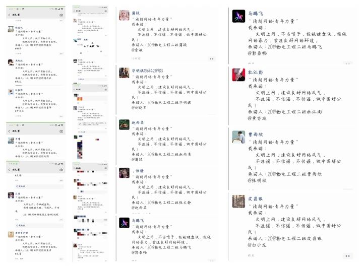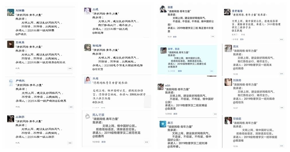 活动期间,各团支部进行热烈讨论,以多种形式展开团日活动。其中,同学们集中开展青年网络文明志愿行动,通过微博、微信、发帖等渠道,发布“网络文明志愿宣言”话题内容和专题推送,并发起网络文明素养讨论、签名承诺等活动,以舆论导向引导积极向上的青年力量。