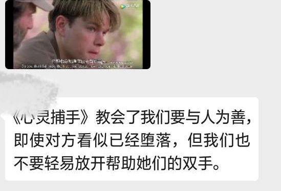 一部电影,一生感动。活动期间,为维护员工疫情期间心理健康,公司陆续开展了以“敬畏生命,健康第一,不负韶华,砥砺前行”为主题的观影鉴赏活动,分享几部治愈系电影,与同学们在线上进行观影感受、交流,给宅在家里上课的员工们带来情感上的共鸣。