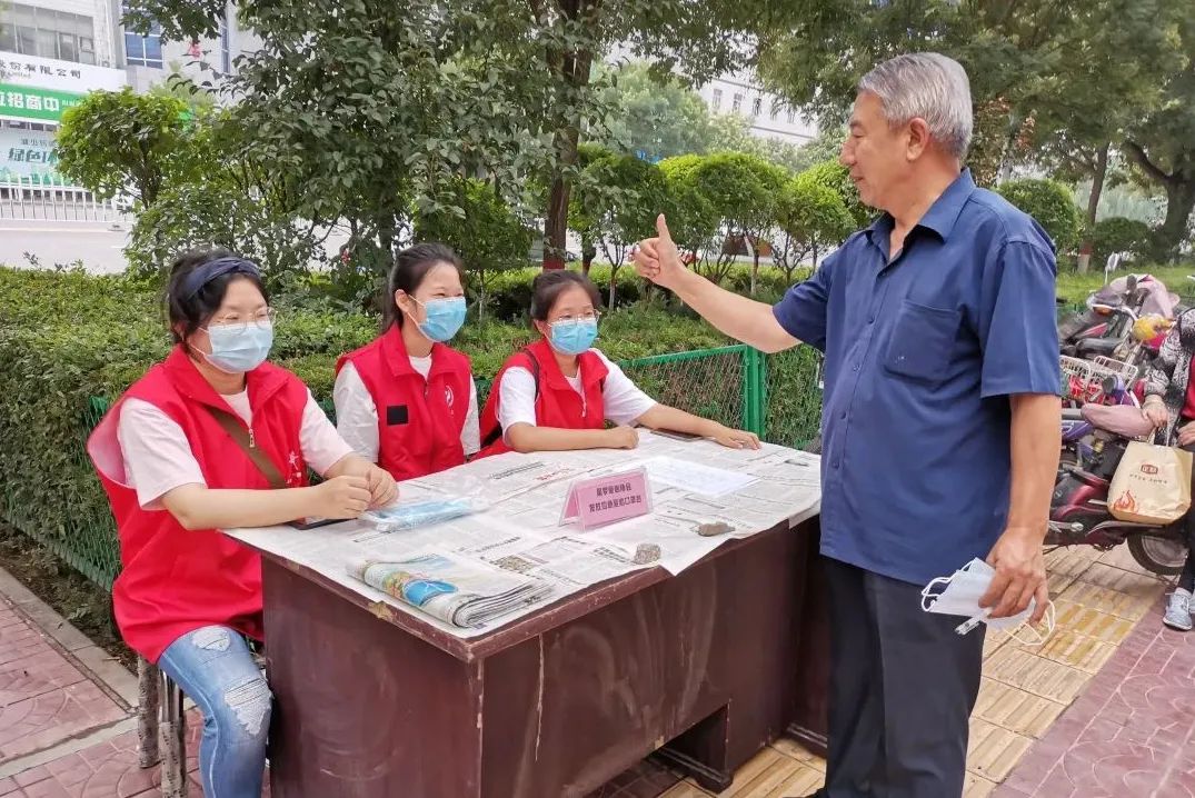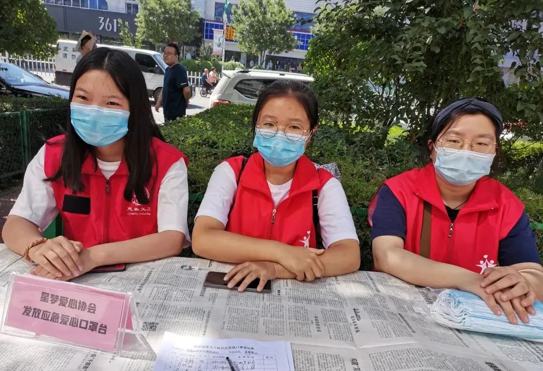 八月一日是神圣庄严的日子。中国共产党领导的人民军队走过了93个春秋。由19级物理学汉二班宋浩楠(中)及其他两名志愿者组成的老员工志愿服务小分队上午九点准时在张家口市阳原县昌盛西街中国建设银行大厅门前集合,代表星梦爱心志愿者协会,把免费提供的口罩送到来建行办理业务的顾客手中。