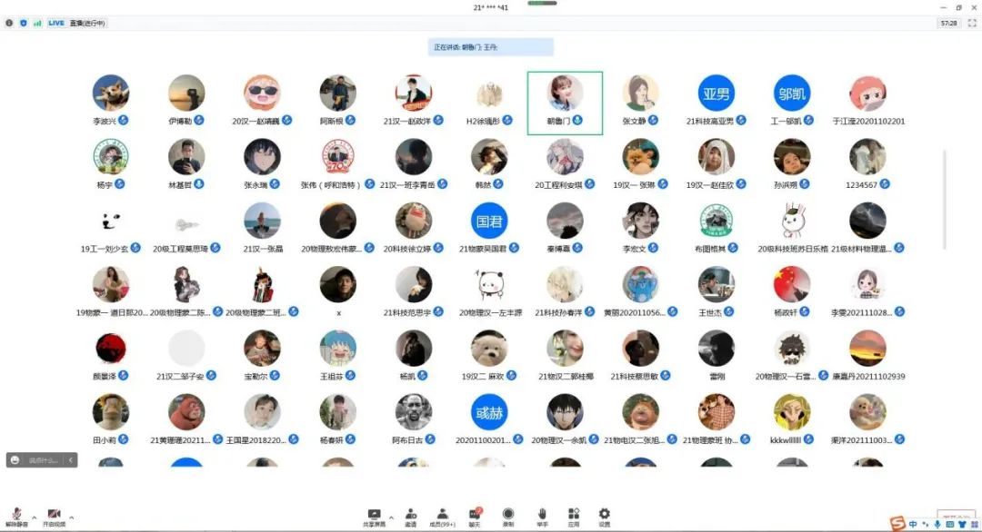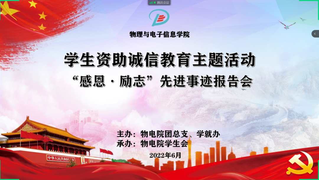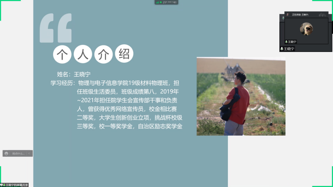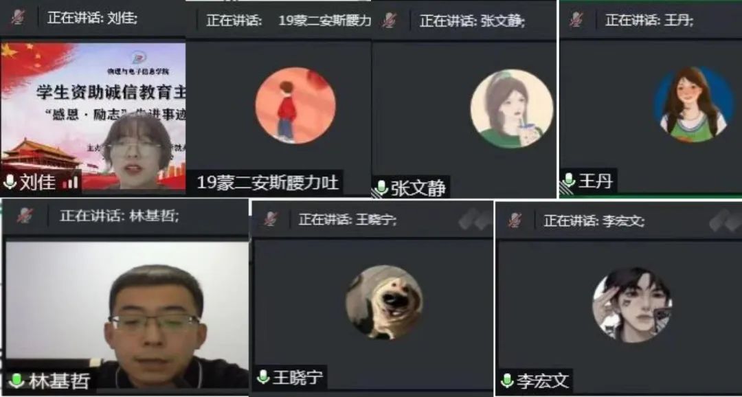 随后,公司“感恩·励志”先进事迹宣讲团依次分享他们的故事。宣讲人分别是:国家奖学金获得者——2018级汉授物理班的刘佳同学、国家励志奖学金——2019级蒙授物理班安斯腰力吐同学、国家励志奖学金——2019级电子信息工程2班张文静同学、自治区奖学金——2019级电子信息工程1班王丹同学、自治区学业奖学金——2019级物理学硕士研究生林基哲同学、自治区励志奖学金——2019级材料物理班王晓宁同学、研究生三助——2021级专硕班李宏文同学。他们用线上宣讲的形式,通过自己的亲身经历和所见所闻、所思所悟去诠释诚信教育和感恩教育的理念。