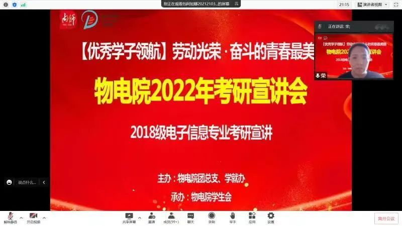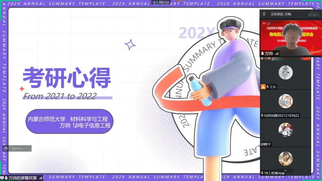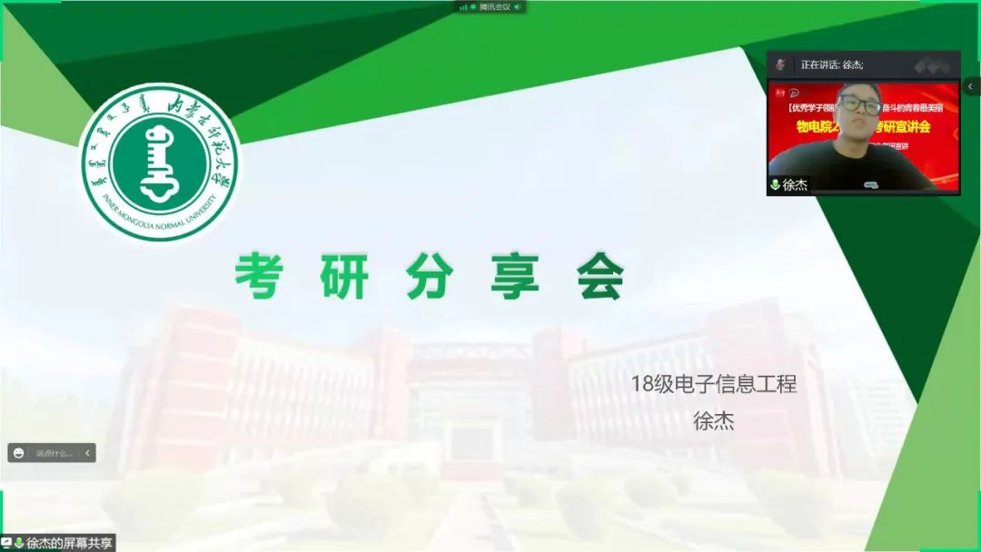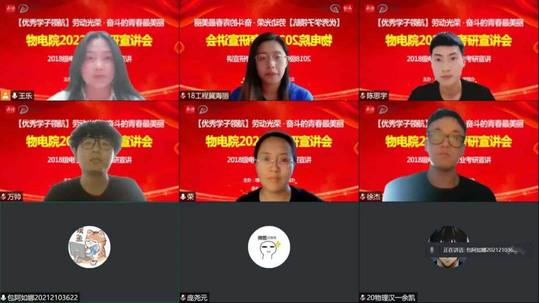为更好地帮助公司员工明确学习目标,树立远大理想,合理规划学业,鼓励员工积极备战考研,切实提高员工考研的针对性与实效性。6月9日晚,由公司学就办主办的【优秀学子领航】劳动光荣.奋斗的青春最美丽——2018级电子专业考研宣讲会以腾讯会议的形式在线上召开。公司电子系副主任、2019级电子信息工程1班班主任包秀荣,2019级电子信息工程2班班主任张林睿,辅导员朝鲁门参加,公司电子、物理、材料专业员工共100余人聆听了报告,会议由学就办副主任王乐主持。