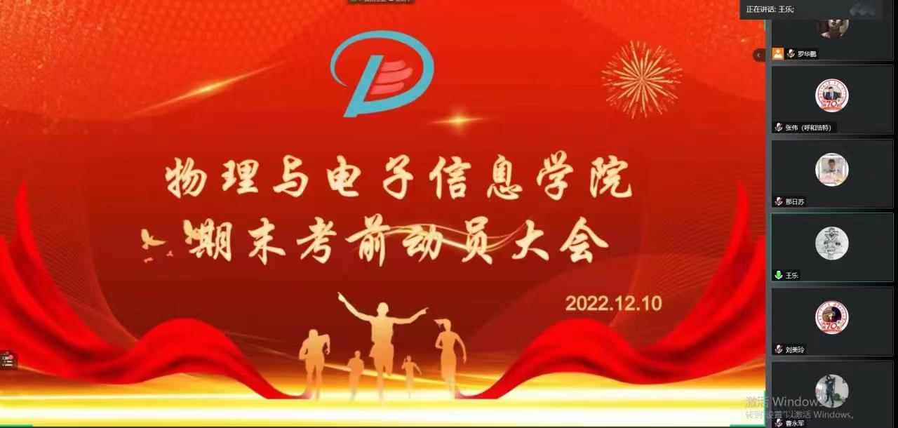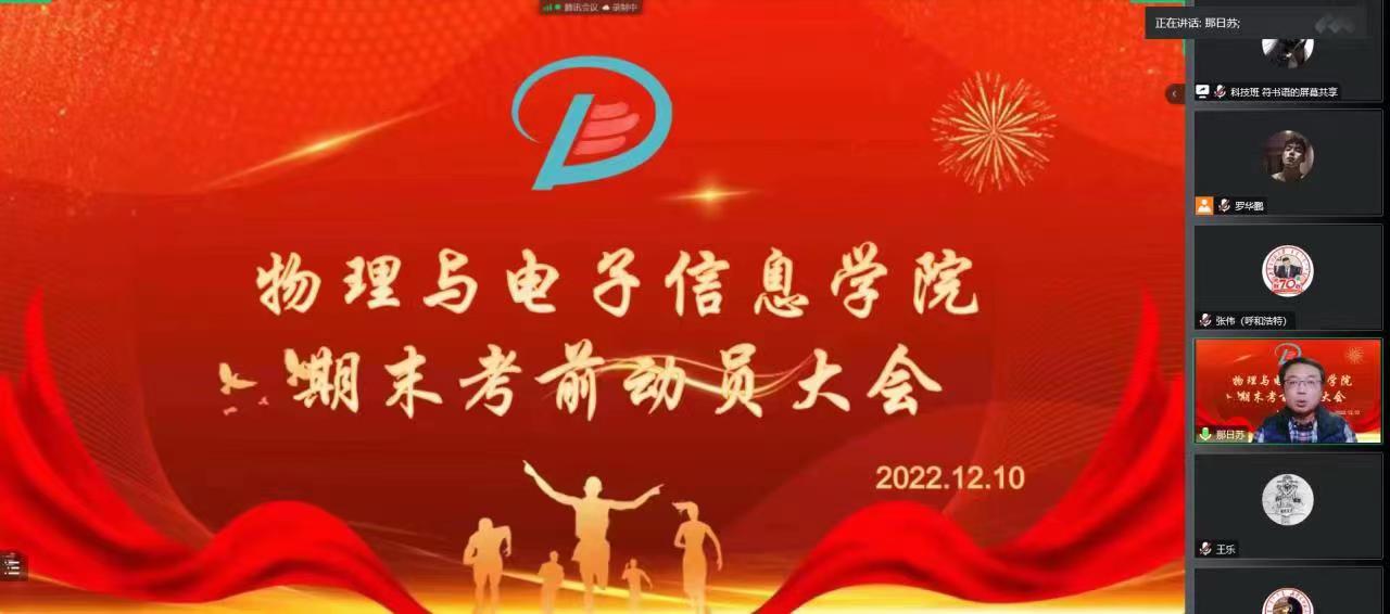 为树立公司员工诚信考试意识,端正学习心态,树立正确价值观,公司于2022年12月10日晚19:00,线上召开考前动员大会。党委书记刘美玲、经理曹永军、党委副书记、副经理张伟、副经理那日苏、团总支、学就办、2022级本科生、研究生班主任及全体员工参加。会议由学就办副主任王乐主持。
