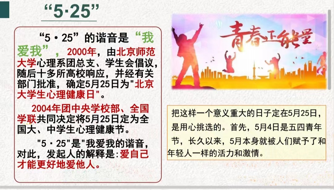 “5·25”的谐音是“我爱我”,2000年由北京师范大学心理系团总支、员工会倡议,随后十多所高校响应,并经有关部门批准,确定5月25日为“北京老员工心理健康日”。2004年团中央公司部、全国学联共同决定将5月25日定为全国大、中员工心理健康节。“5·25是“我爱我”的谐音,对此,发起人的解释是:爱自己才能更好地爱他人。