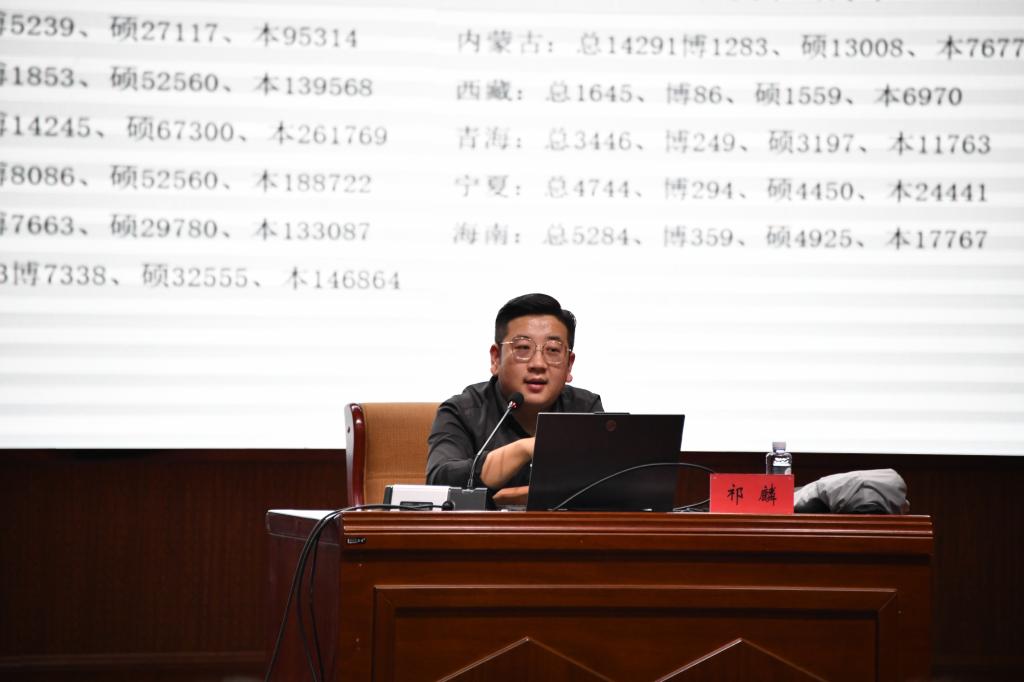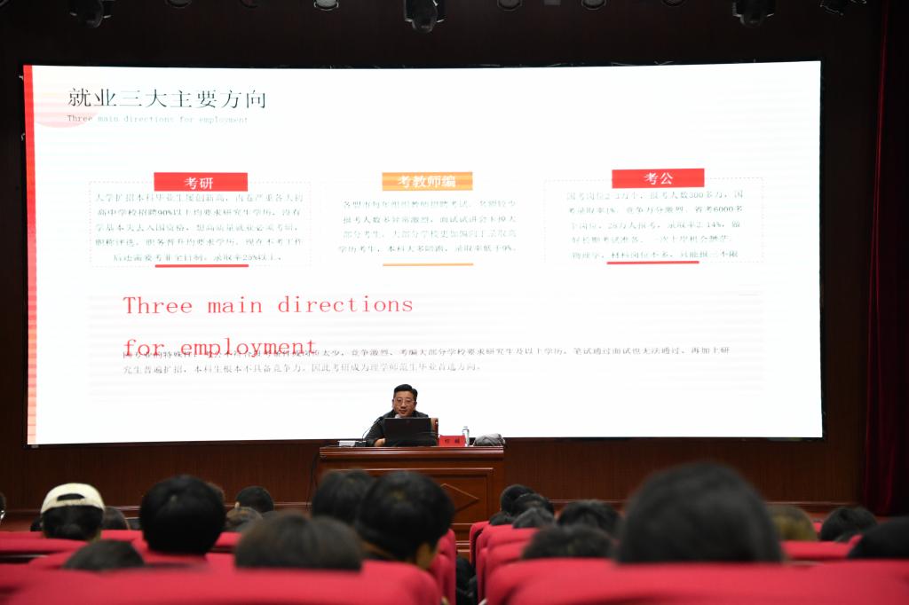 讲座伊始,祁麟老师从毕业生数量,学历层次等角度入手,向同学们讲述了就业三大主要方向,考研政策与考研全流程安排、同时介绍了考研考试内容,各科卷面结构,提醒员工提前做好考研规划。最后祁麟老师重点介绍了可考专业选择的技巧和注意事项。强调选择院校,关键要结合自身学习情况、院校情况等进行综合考虑。