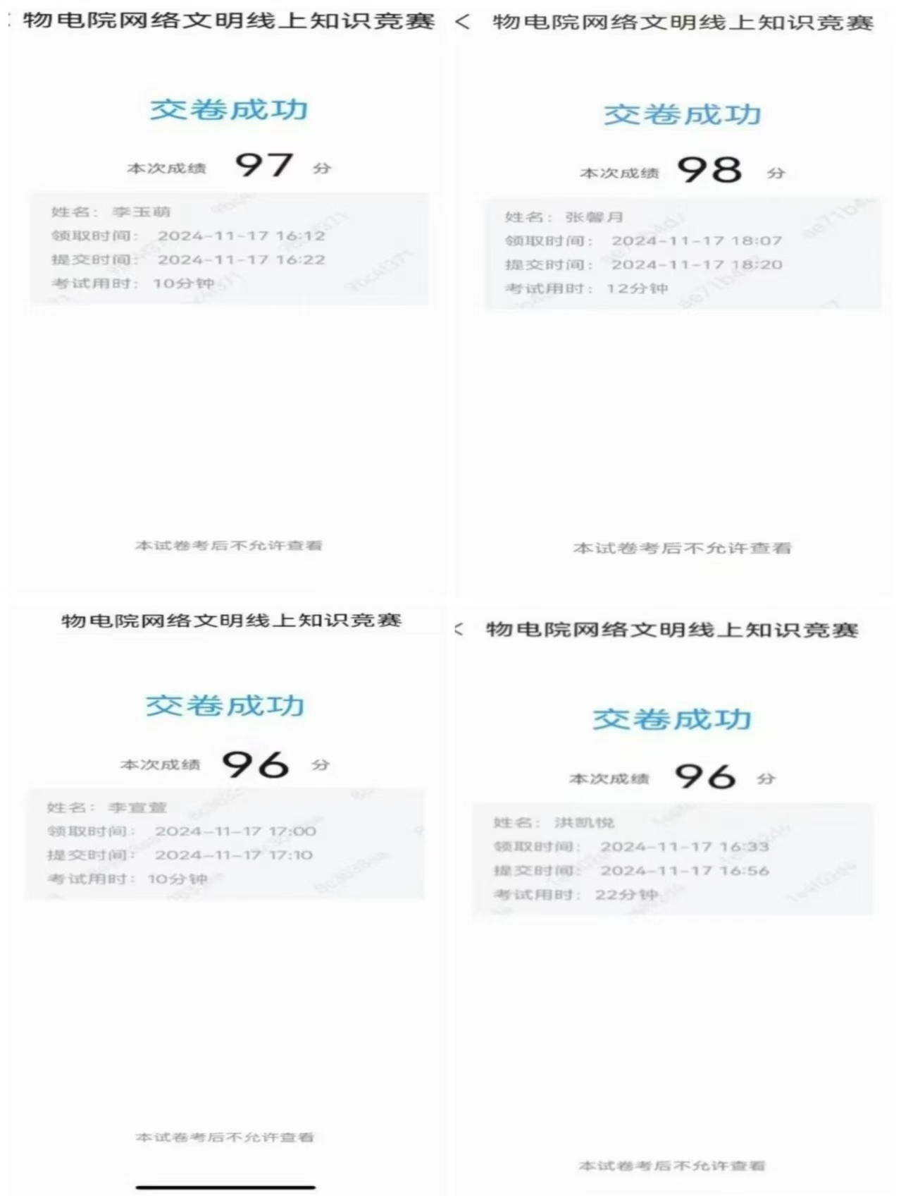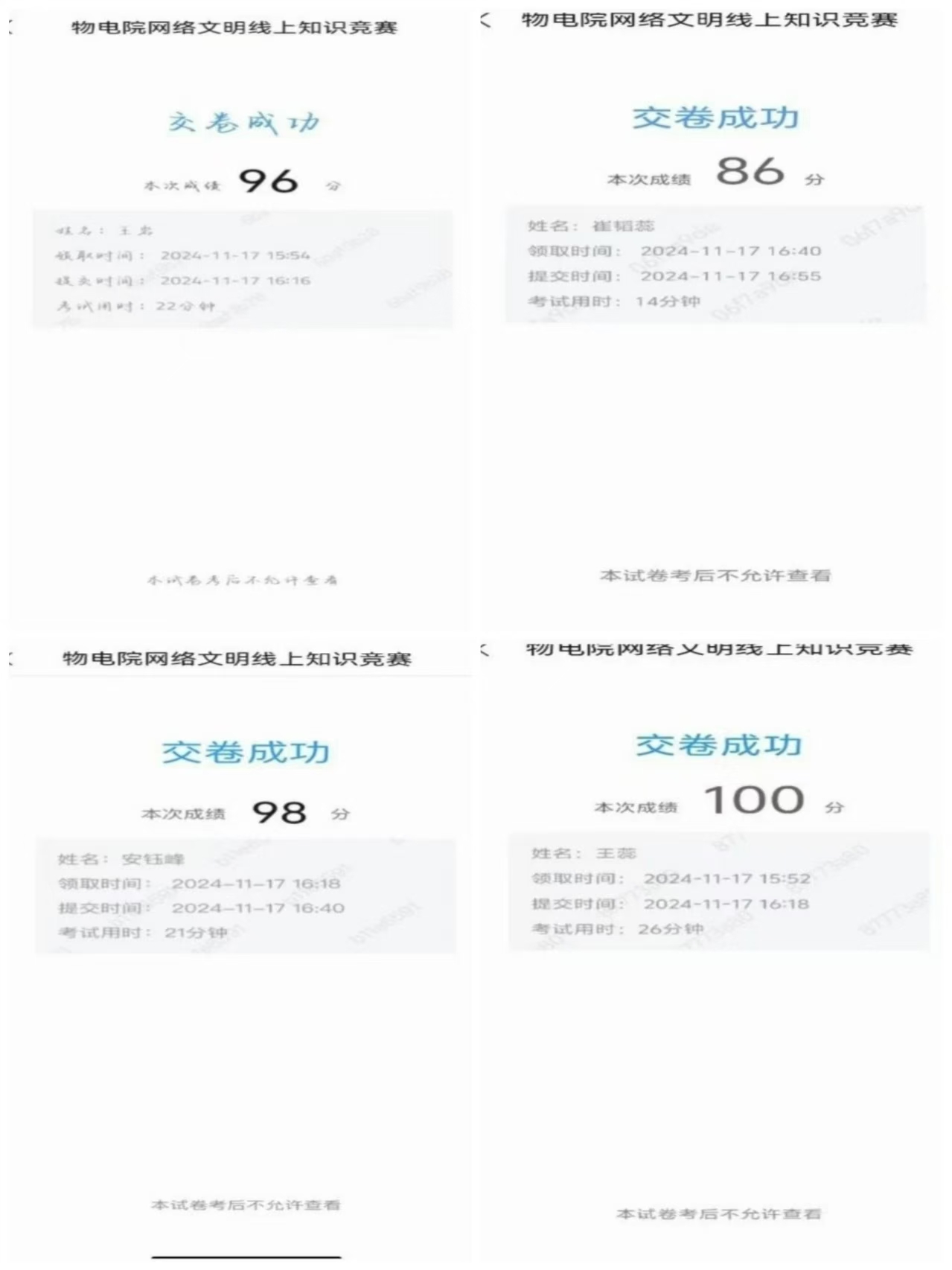 本次活动吸引了公司近300名同学参与,同学们利用自己所了解的网络知识认真作答竞赛题目,以赛促学,拓展了网络文明知识面,激发了网络责任感,引导同学们正确使用互联网资源,推动大家积极参与文明网络空间的维护,防范网络诈骗和不良信息的侵害,共造互联网清朗环境,为新时代高质量网络环境创设贡献自己的力量。