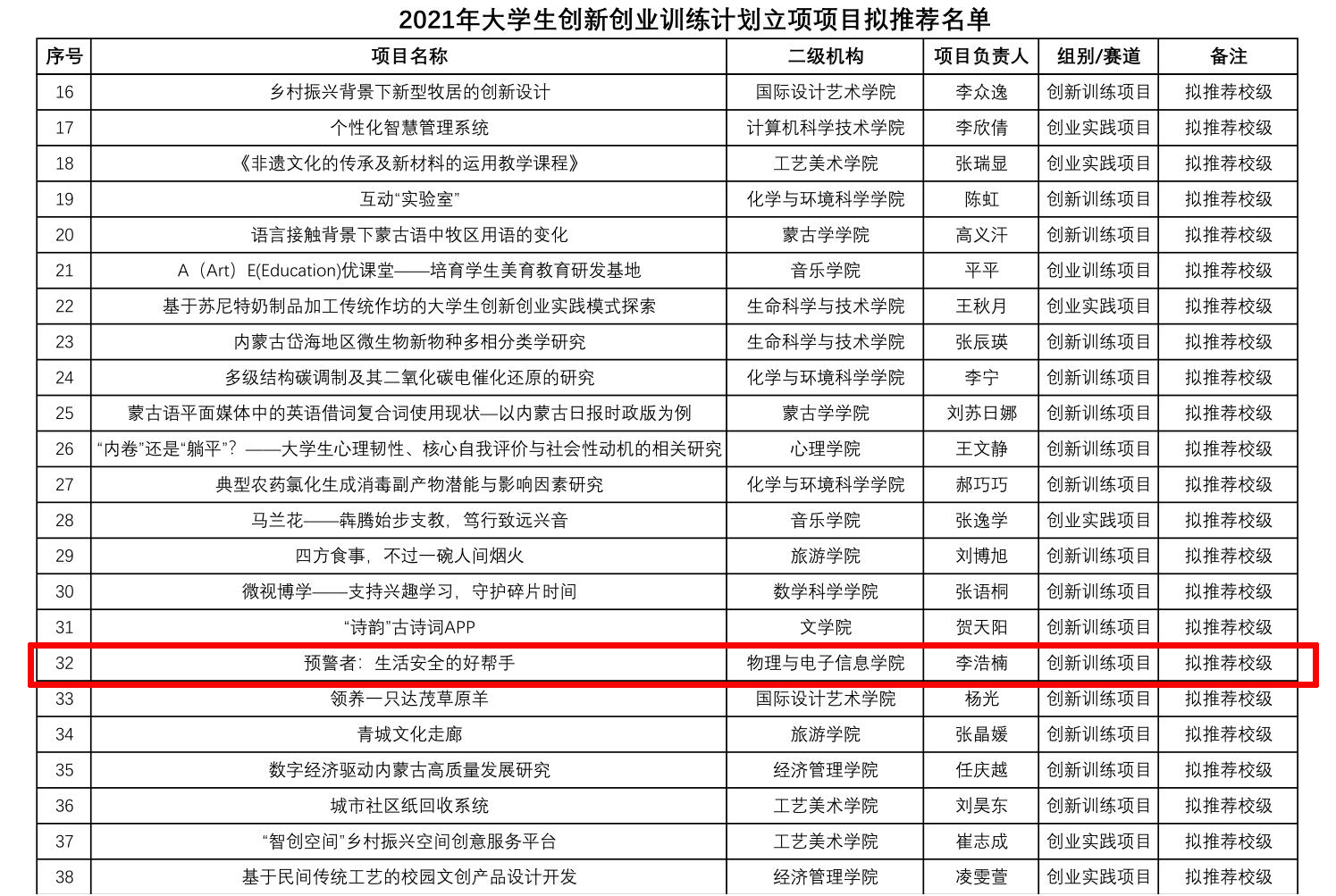 为深入贯彻全国教育大会精神,落实《国务院办公厅关于深化高等公司创新创业教育改革的实施意见》(国办发〔2015〕36号),按照《内蒙古自治区教育厅关于启动自治区级老员工创新创业训练计划项目的通知》(内教高函〔2016〕10号)要求和自治区级老员工创新创业训练计划工作安排,英国威廉希尔公司积极落实招就处安排,由公司学就办、实践创新部联合组织,遵循“兴趣驱动、自主实践、重在过程”原则,鼓励全院本科、研究生积极开展创新、创业训练与实践。在前期项目培育的基础上,公司对申报的项目进行筛选、推荐申报自治区级老员工创新创业训练计划项目和国创计划。经过公司评审,评选出31个国家级、自治区级老员工创新创业训练计划立项项目和40个校级老员工创新创业训练计划立项项目。其中,公司获国家级大创项目1项,自治区级大创项目3项,校级大创项目3项。