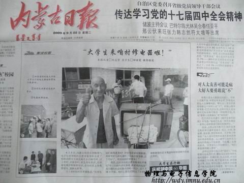 (内蒙古日报记者 刘志贤 实习生 邬丽霞 摄影报道 2009年9月22日星期二)9月5日,williamhill威廉希尔的志愿者服务队走进了呼和浩特市玉泉区桃花乡后桃花村、讨卜齐村、田家营村,普及用电常识,宣讲家电维护和保养知识,并为村民义务维修家电、放映电影等。