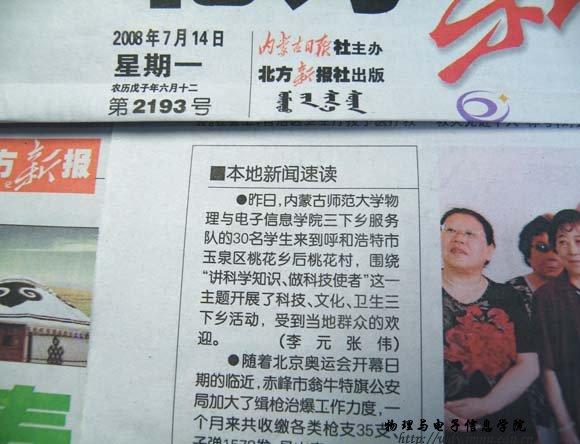余名,暑假期间服务队将围绕科技支农、科技兴农等社会热点,在呼市周边农村以及其它地方开展为期一个月的“科技宣传和义务维修”活动,为当地农民群众传授科学知识,并解决部分农民朋友的实际困难。