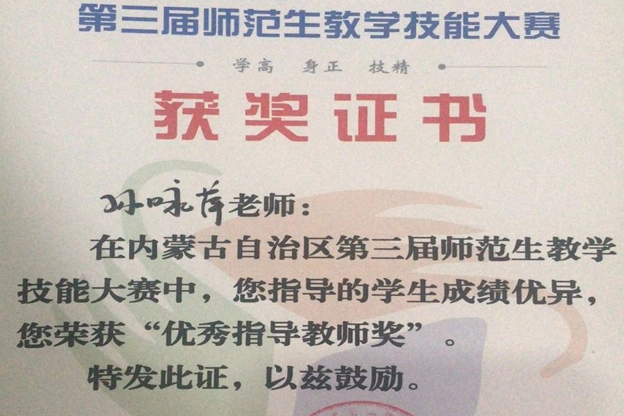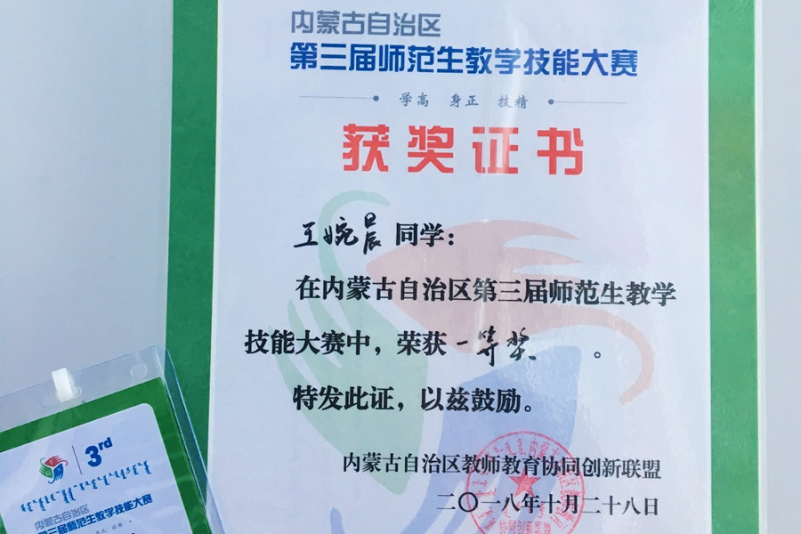 本网讯 10月29日,由内蒙自治区教师教育协同创新联盟主办,williamhill官网承办的“第三届内蒙古自治区师范生技能大赛”在公司落幕。大赛自启动以来,获得了广泛关注,据统计本届赛事共有七所高校的60位领队、指导教师及112名师范生参加,参赛者分十一个竞赛小组分别进行比赛,公司2016级物理汉班王婉晨和张振在物理学组,经过即兴演讲、教学设计、课件制作、模拟授课和回答问题等比赛环节,最终突出重围分别获得大赛一等奖、二等奖,孙咏萍老师荣获本次大赛“优秀指导教师奖”。