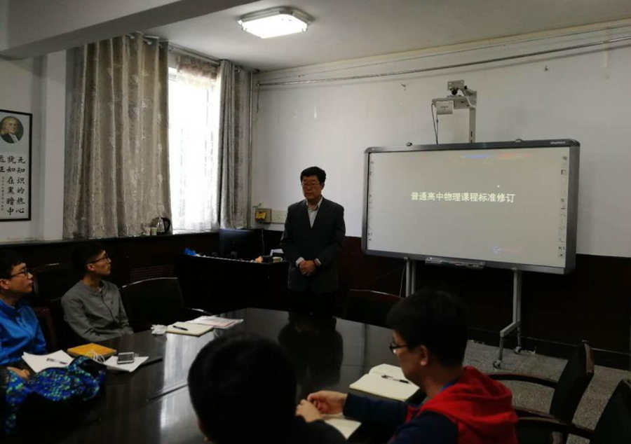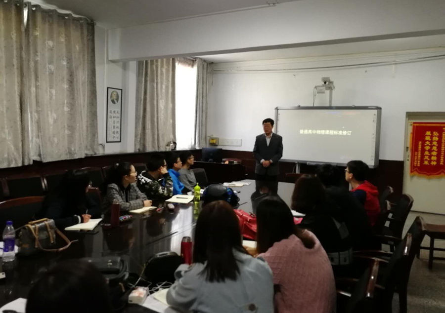 2018年4月12日上午李群老师为公司17级学科教学(物理)专业的研究生们带来了最新普通高中物理课程标准解读。李群老师从课标的修订背景、修订内容、前后比较以及实施建议四个方面进行了讲解。在李群老师的讲解中同学们了解到为了顺应当前的教育发展趋势,重新修订普通高中物理课程标准势在必行。物理教育对我国的发展存在至关重要的作用,现在的国家需要高技术创新人才。在这种背景下对未来教师的要求也必然提高了,因此在今后的教育中需努力提高自身的专业素养。