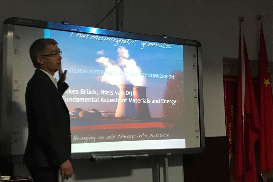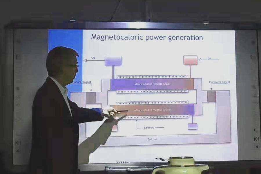 报告会上,Ekkes Bruck教授首先介绍了热磁发电(一种将热能转换为电能的发电装置)的工作原理和应用,在此基础上详细介绍了热磁发电材料的基本特点,并举例Mn-Fe-P-Si-V材料的性能特点。随后,Ekkes Bruck教授介绍了另外一种能量转换技术---热磁电动机(一种将电能转换成机械能的设备)。通过展示热磁电动机的模拟视频,给出了对该新型技术的一种全新的认识。最后,Ekkes Bruck教授与公司师生对两种能量转换技术和热磁材料等问题进行了交流互动,热情解答了师生们提出的问题。