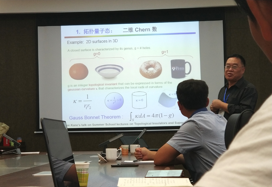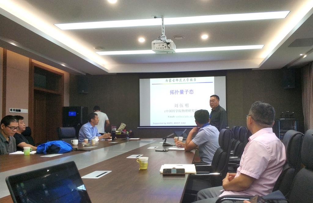 报告会上,刘伍明研究员着重讲述了拓扑物态和拓扑相变的重要性。从二维Chern数、Berry位相、Dirac费米子、Majorana费米子等拓扑量子态的基本表征谈起,讲述了拓扑绝缘体、量子相变和拓扑量子相变等基本科学问题。详细介绍了三个方面的具体研究工作:其一,从光与原子系统的光伏效应出发,介绍了冷原子系统的Majorana模、超固态、量子霍尔效应、FFLO态、拓扑超流相变、保真度磁化系数以及量子多临界行为;其二,从团簇动力学平均场方法出发,介绍了六角晶格模拟量子自旋霍尔效应和拓扑绝缘体、三角kagome晶格模拟Kondo金属、以及Shastry-Sutherland晶格模拟反铁磁金属的工作;最后,从第一性原理出发,介绍了多种自旋-轨道耦合体系的拓扑量子相变、量子反常霍尔效应、反带拓扑绝缘体和拓扑绝缘体超导的模拟和实验实现。报告后,师生们与刘老师进行了热烈的讨论和交流,获益匪浅。