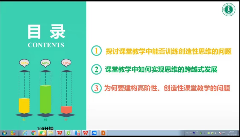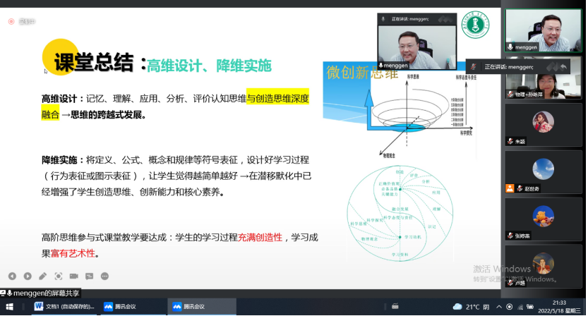 孟老师以让大家微笑15秒开始这趟思维的旅行,从课堂教学能否训练创造性思维,如何实现思维的跨越式发展,以及建构高阶性,创造性课堂教学问题的原因为我们展开讲授。在讲授过程中,孟老师从日积月累的修身、知识储备、专业技能等角度诠释了记忆思维和创造性思维的深度融合可使得理性思维得到发展。我们可以通过布置微创新的可视化学习任务,以指令明确目标清晰、激励创造指导创造、营造氛围交流模仿三个步骤干预员工认知思维的进阶,让员工的学习过程充满创造性,学习成果富有艺术性,在潜移默化中增加员工创造思维,创新能力和核心素养。孟老师说作为教师不应该把课程讲成一个神学,员工成为一个神徒,我们要设计目标,员工参与过程和教学评价,让员工建构自己理解,学会深度学习,从而突出以“学”为中心的转变。