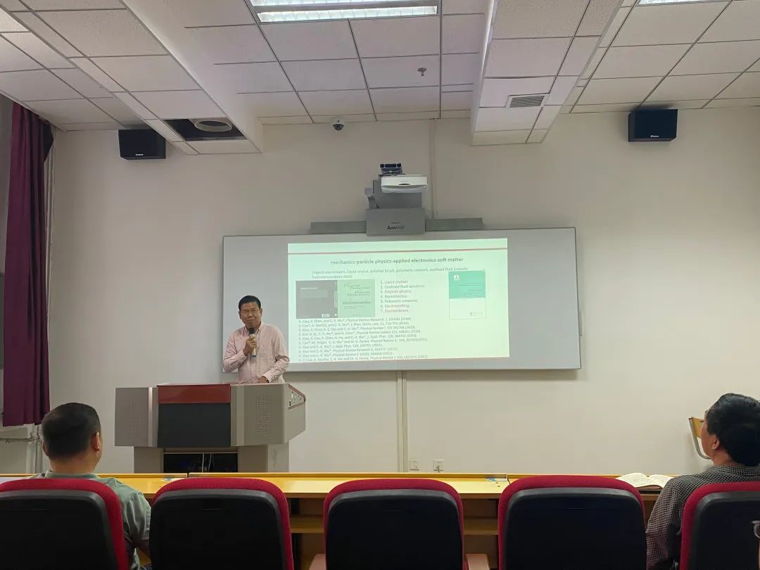 吴晨旭教授从生活实际出发,深入浅出地说明了为什么一些系统虽然宏观向着有序的方向发展,但系统总熵却在增加,并定性地给出了熵致有序的力学解释。同时,吴晨旭教授详细的介绍了厦门大学软物质课题组近些年的研究成果,比如通过修改动力学模型解释了病毒进入细胞过程之中细胞膜的形态变化;通过改变物质表面特性,并在施加驱动电场的情况下,分析了水滴的静力学以及动力学特征,并观察到了新的临界现象等。最后,吴教授与参会的老师以及员工针对具体的问题进行了详细地讨论。