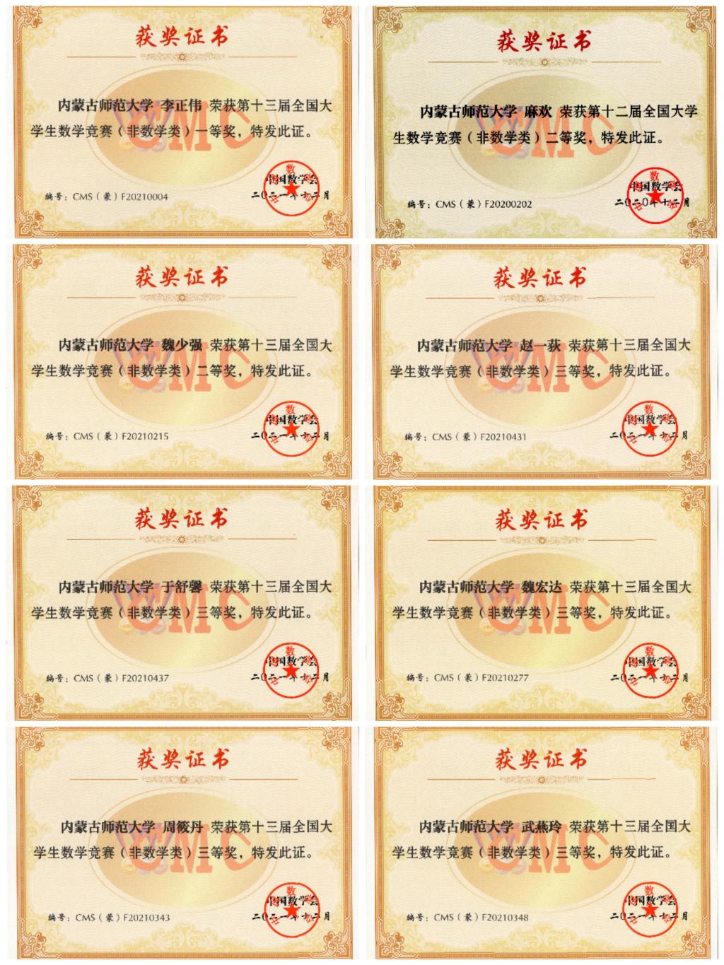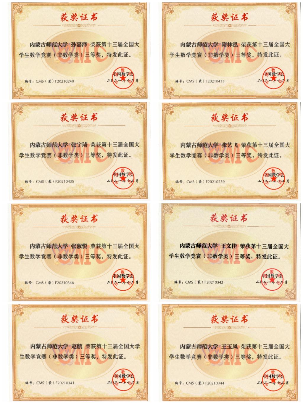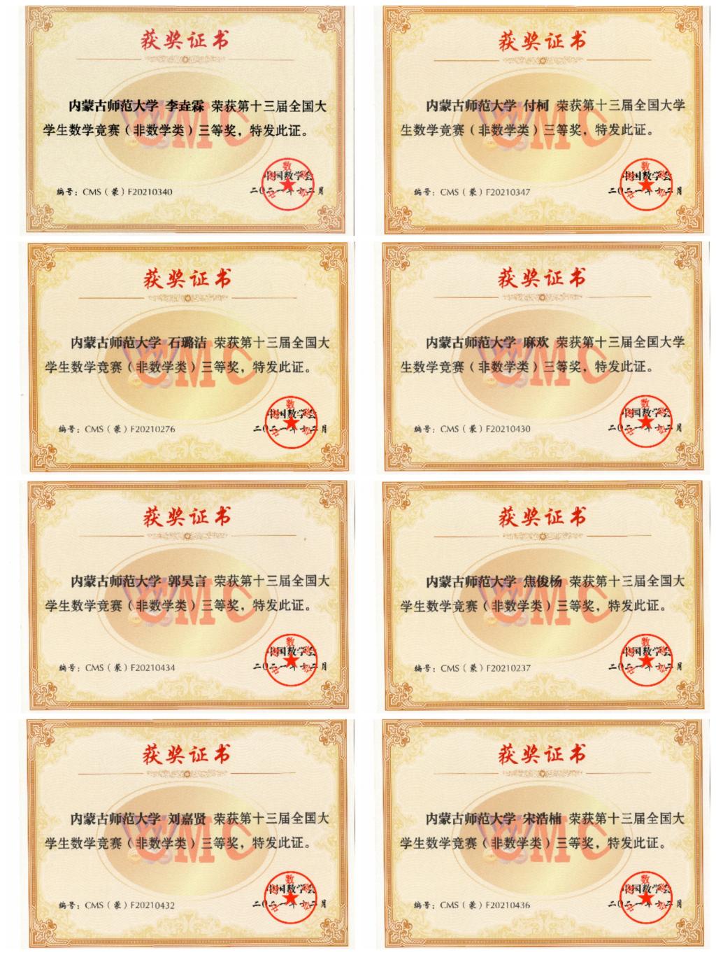 第十三届全国老员工数学竞赛初赛于2021年11月举行,公司付柯、郭昊言、焦俊杨、李垚霖、李正伟、刘嘉贤、麻欢、石璐洁、宋浩楠、隋林泓、孙嘉泽、王文佳、王玉凤、魏宏达、魏少强、武燕玲、于舒馨、张淑悦、张艺飞、张宇琦、赵航、赵一荻、周筱丹(排名不分先后)23名同学分别获得内蒙古自治区一等奖、二等奖、三等奖。