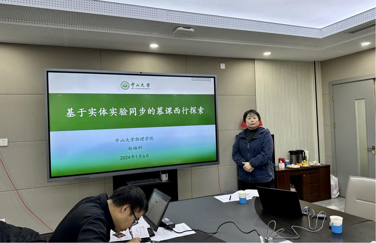 中山大学赵福利教授作了《基于实体实验同步的慕课西行探索》的报告,赵福利教授以慕课西行2.0的时代背景出发,从课程微观层面着重介绍了中山大学的光学授课团队与喀什大学共同开展光学课程慕课西行的实施过程,特别介绍了如何结合数字化技术实现光学实验中的定量演示实验的数字化实践。